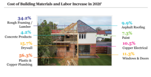 The cost of construction materials rose across the board in 2021. Lumber increased by 34.2%. Plastic & Copper Plumbing rose an astounding 56.3%. Asphalt Roofing increased by a much more reasonable 9.9%.